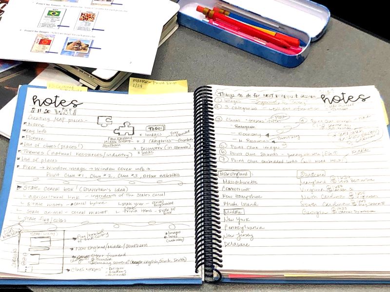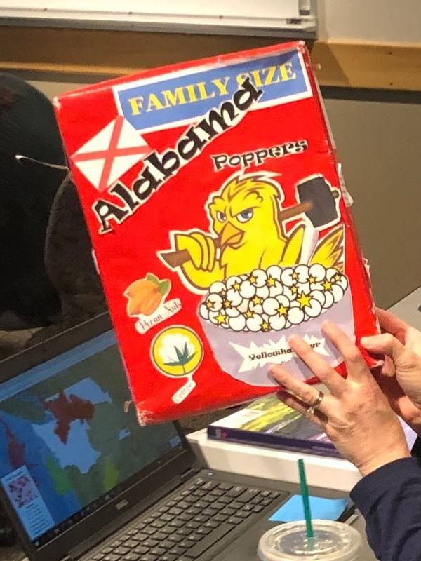 Everyone made good progress in their planning and research. The teachers also shared updates on how they have been using PuzzleMap in their classrooms. Trevor brought a few examples of handmade student-created state cereal boxes featuring new "brands" like "Alabama Poppers" and "Big Sky Country Cereal." The cereal boxes showcased key information that students had learned through using the USA puzzlemap, such as facts related to climate, temperature, famous people and Native Americans.